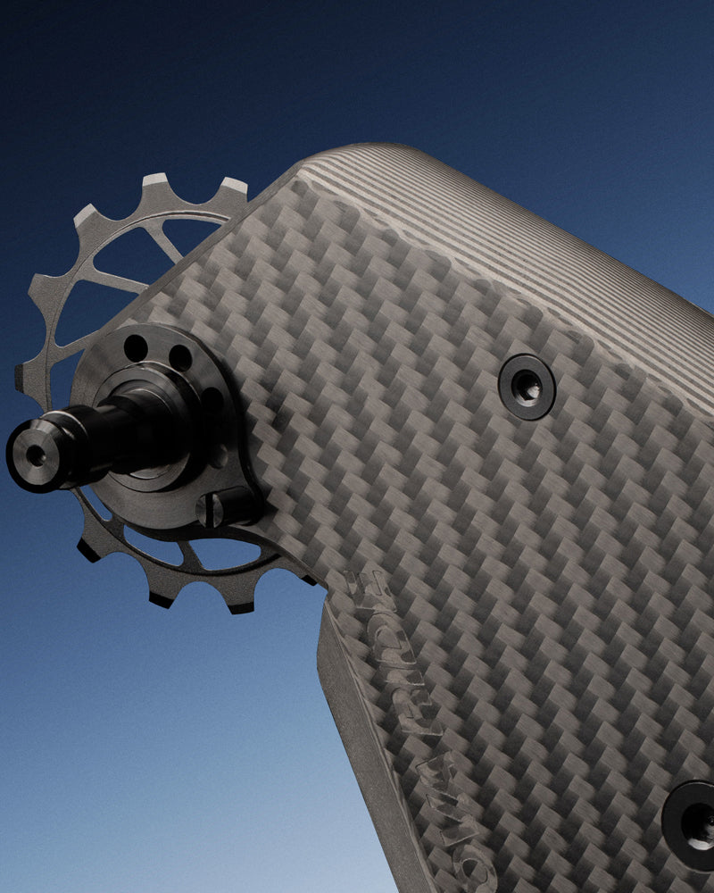 Leichter: Das Design des Karbonkäfigs und der Umlenkrollen wurde komplett überarbeitet, sowohl in Bezug auf die Geometrie als auch auf die Materialstärke, um ein Produkt mit einer moderneren visuellen Harmonie zu bieten und gleichzeitig seine Leichtigkeit und Leistung zu maximieren.